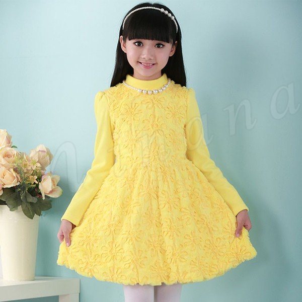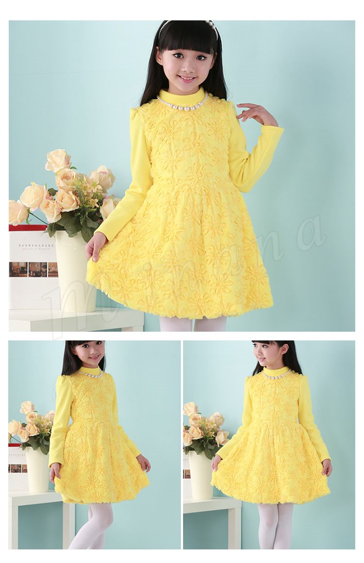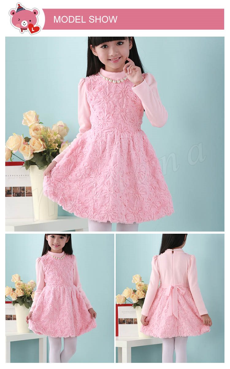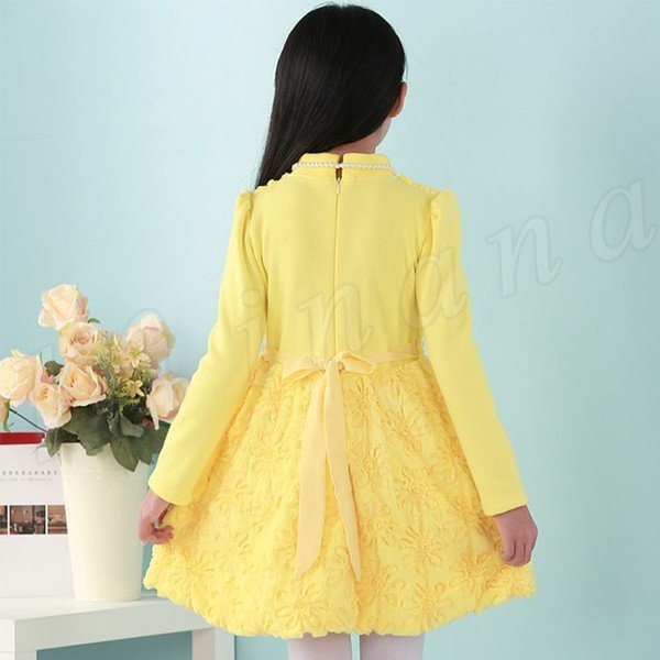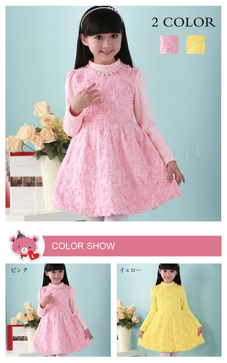 送料無料ワンピース 長袖 無地 レース 姫様 ハイネック パール飾り フレアワンピース 膝丈 花柄 子供服 裏起毛 厚地 あったか
