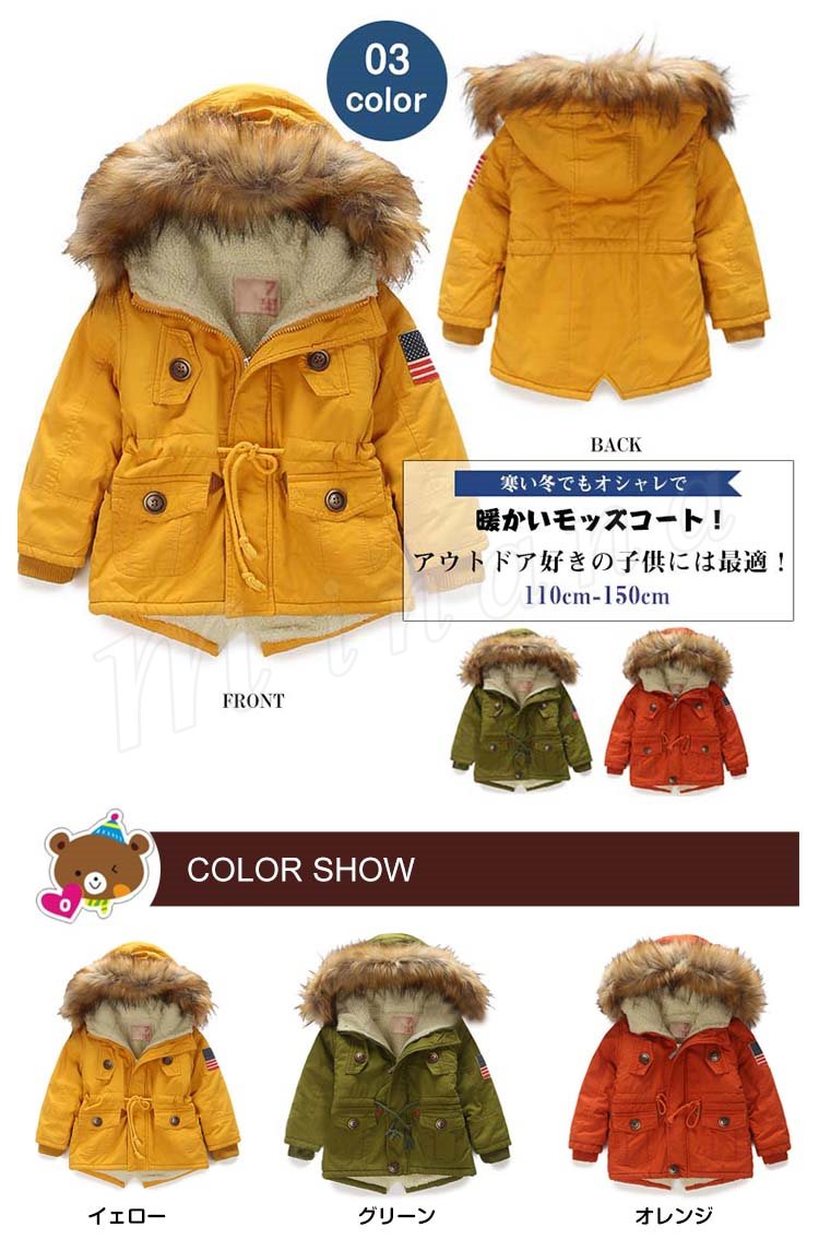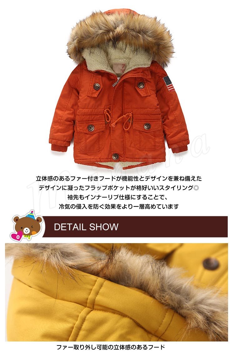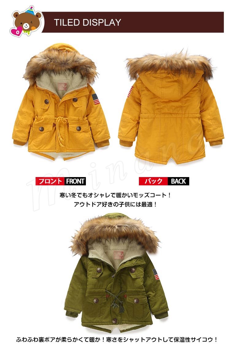 | 寒い冬でもオシャレで暖かいモッズコート!アウトドア好きの子供には最適! ふわふわ裏ボアが柔らかくて暖か!寒さをシャットアウトして保温性サイコウ! 立体感のあるファー付きフードが機能性とデザインを兼ね備えた デザインに凝ったフラップポケットが格好いいスタイリング◎ 袖先もインナーリブ仕様にすることで、冷気の侵入を防ぐ効果をより一層高めています | |