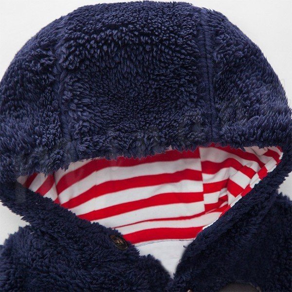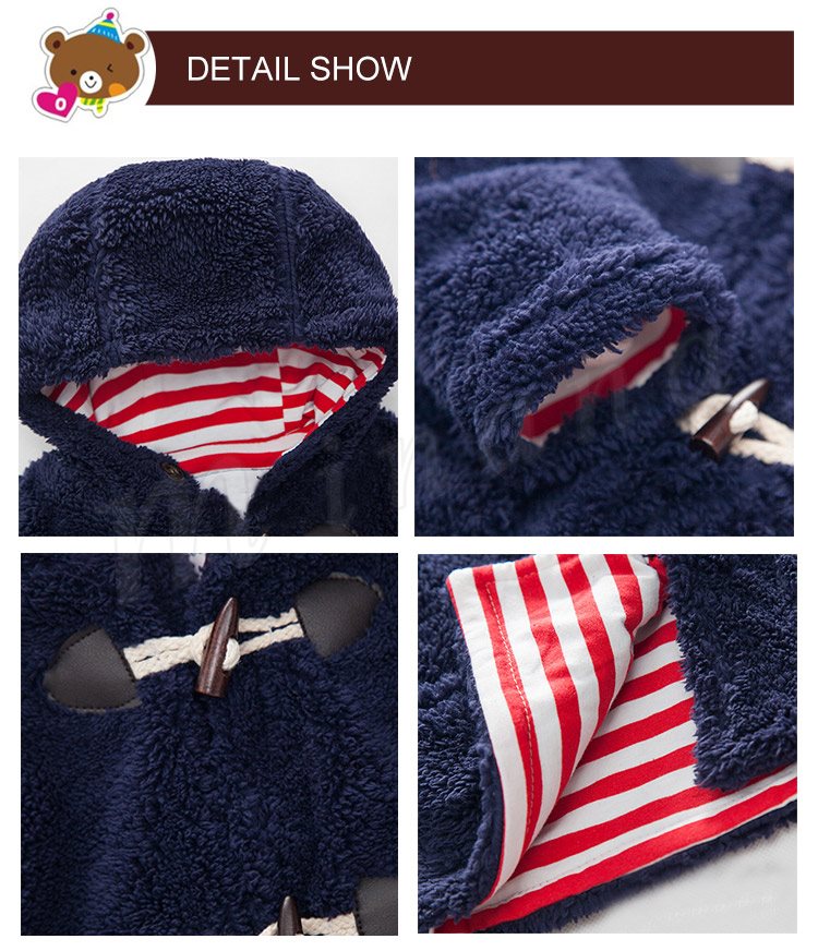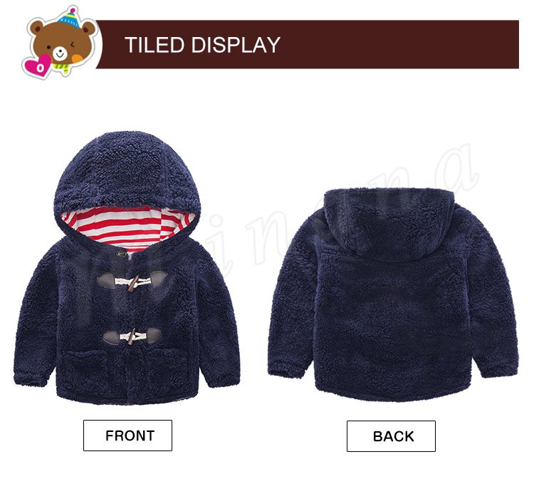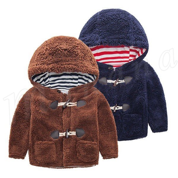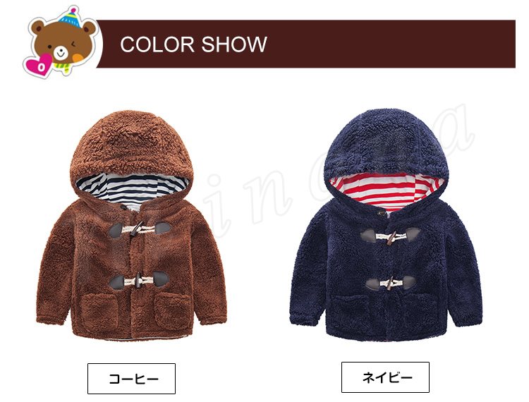 送料無料子供服 ダッフルコート フード付き 裏ボーダー柄 もこもこ 厚地 トップス 前開き アウター ショートコート あったか 防寒