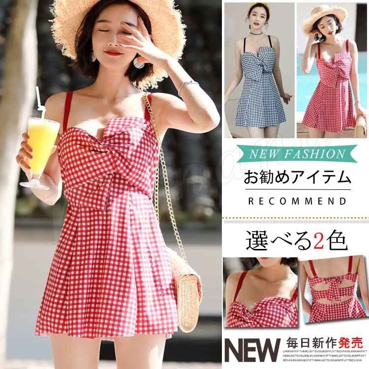 水着 レディース 体型カバー 水着 セパレートワンピース チェック 肩出しカバーアップ 水着 スイムウェア 女性用 ママ可愛い 海水浴 温泉 ビーチ