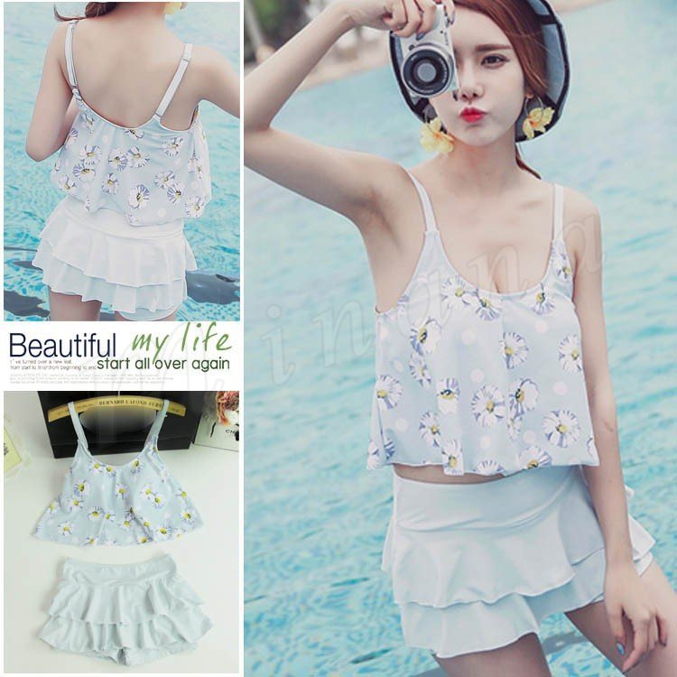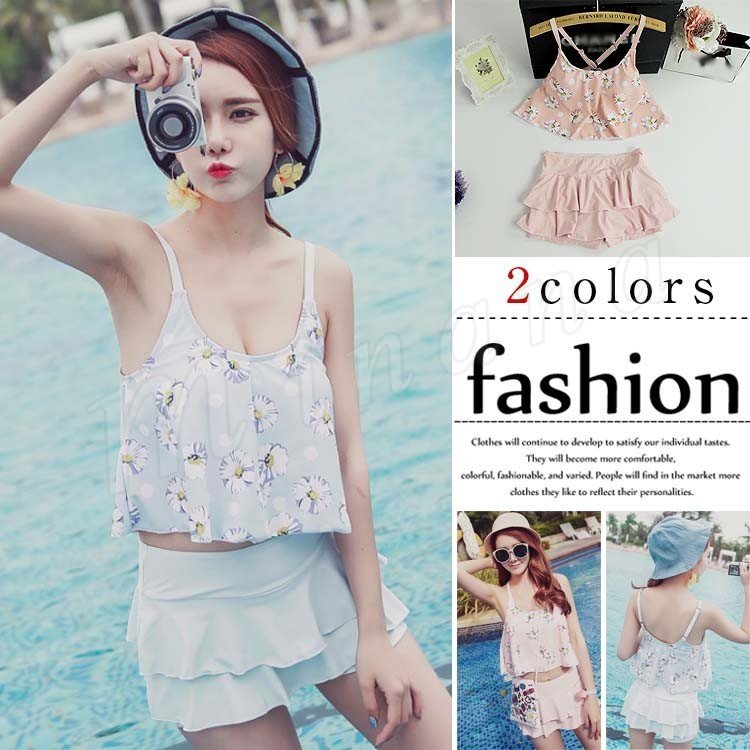 水着 レディース タンキニ ビキニ 2点セット トップス+スカパンの2点セット 花柄 大きいサイズ ノンワイヤー パッド付き 可愛い 乙女