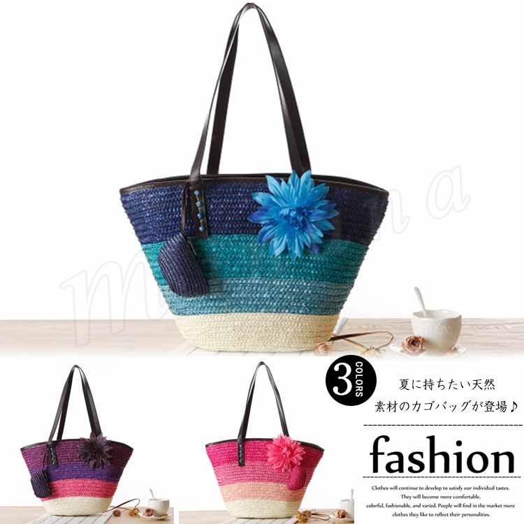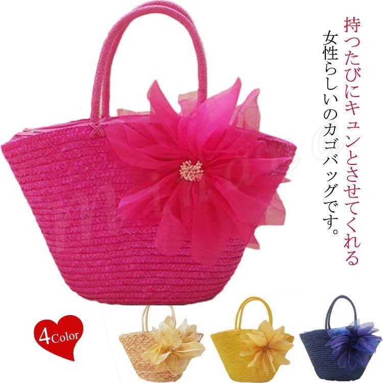 レディース バッグ かごバッグ トートバッグ レディース 夏 無地 ストロー カゴバッグ 大容量 ストローバッグ コサージュ付き 大人可愛い 肩掛け