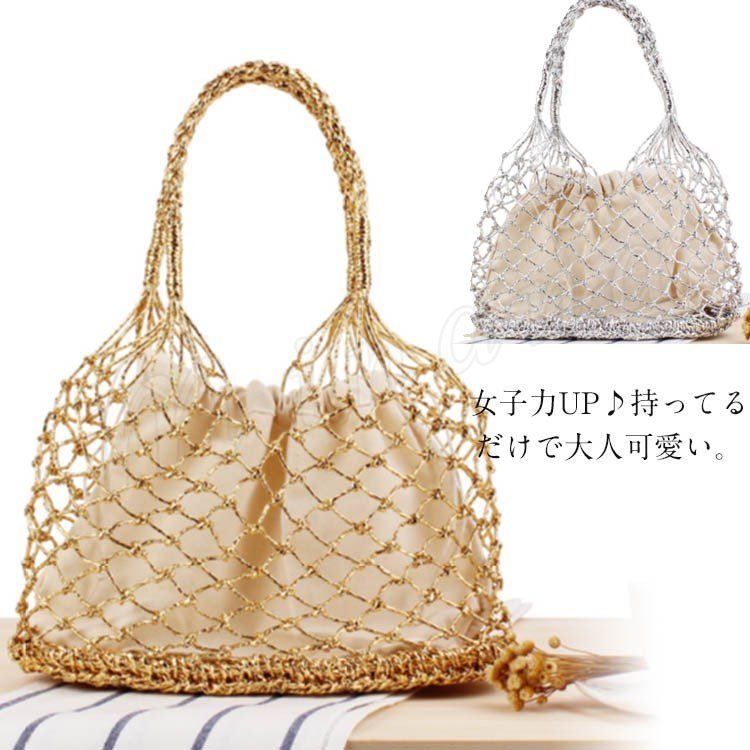 バック カゴバック ショルダーバッグ トートバック バスケット 2way 編み 手持ち 手提げ 肩掛け トート 大容量 軽量 ゴールド シルバー オシ