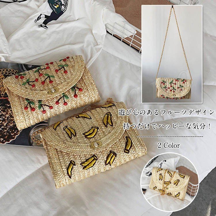 チェリー バナナ ストローバッグ 麦わらバッグ ビーチバッグ 編みデザイン かごバッグ ハンドバッグ 夏バッグ サマーバッグ ペーパーバッグ