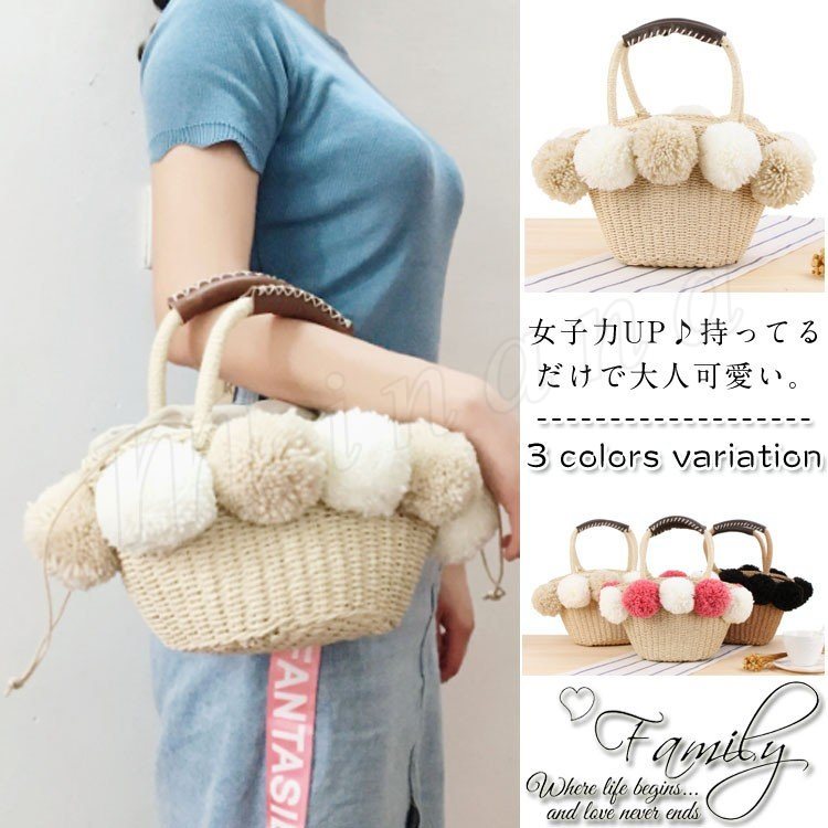 バック かごバック トートバック ハンドバック ショルダーバッグ レディース 編み 手提げ 手持ち トート 軽量 大容量 大きめ ポンポン付き