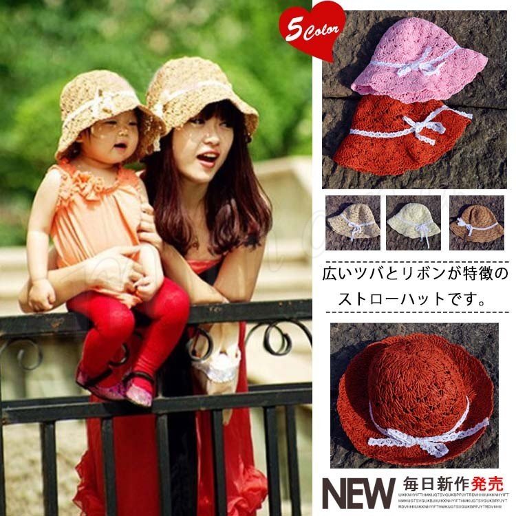 リボン親子ペア親子麦わら帽子中折れストローハットつば広ハットキッズレディース女性用子供帽子リボンつば広ハット