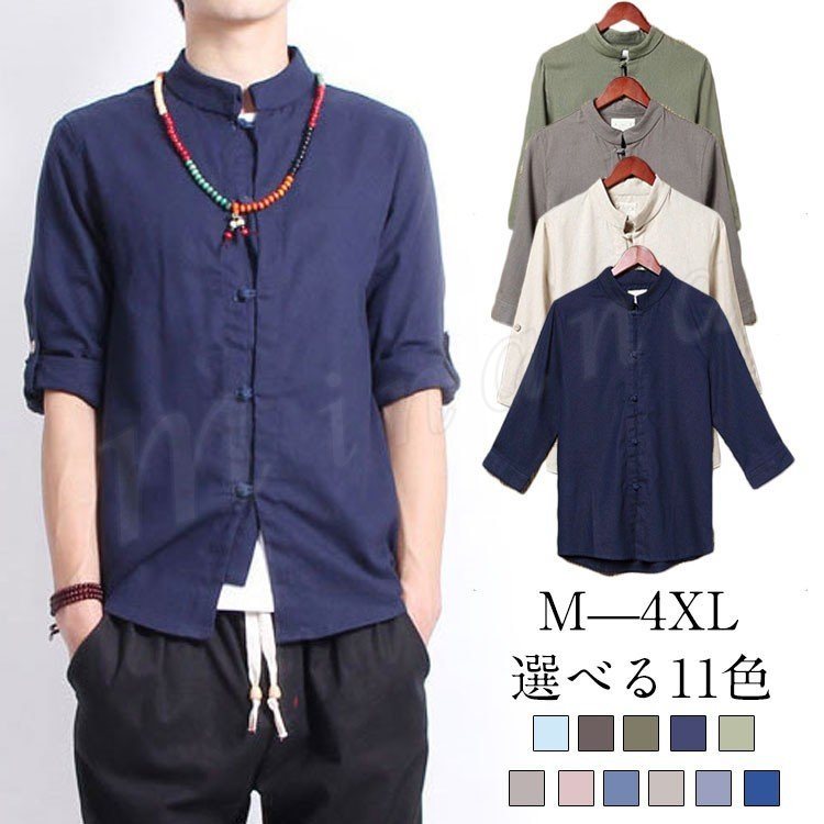 シャツ メンズシャツ 綿麻 リネンシャツ 7分袖 チャイナ風 アジアン風 無地 立ち襟 麻シャツ 綿麻 七分袖 シャツ スリム ショート丈 ZOKO