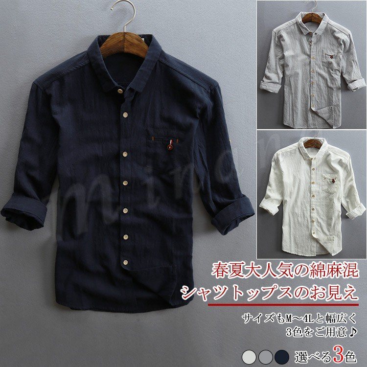 シャツ トップス 綿麻 メンズ リネンシャツ メンズ カジュアルシャツ 五分袖 七分袖 無地シャツ トップス リネン 薄手 春 夏 シンプル