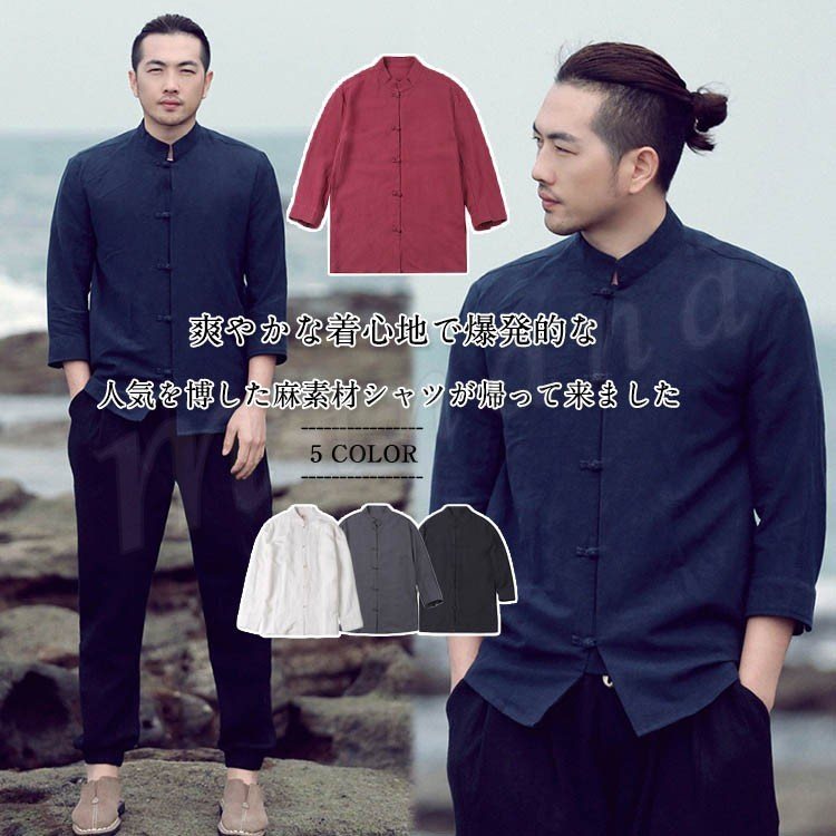 リネンシャツ メンズ 麻生地 7分袖 無地 カジュアルシャツ リラックス チャイナボタン チャイナ風 シンプル ファッション エスニック クラシック