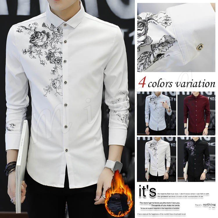 2018秋冬新作/メンズシャツ/カジュアルシャツ/長袖/裏起毛/裏ボア付き/花柄/プリント/防寒/あったか/厚手/ファッション/細身/トップス/お