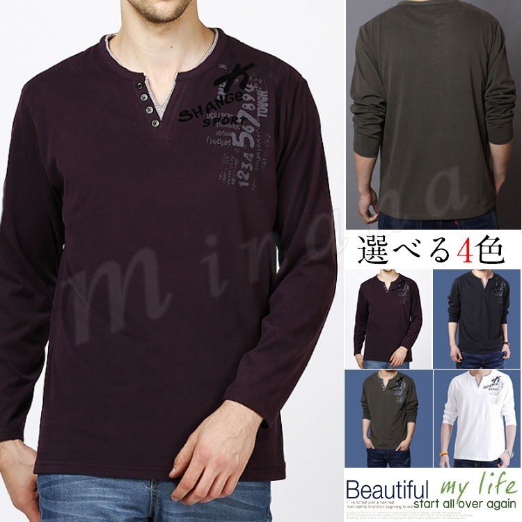 2018秋新作 Tシャツ メンズ 長袖 プリント Vネック tシャツ カジュアル かっこいい トップス 春秋 きれいめ 男性用 おしゃれ