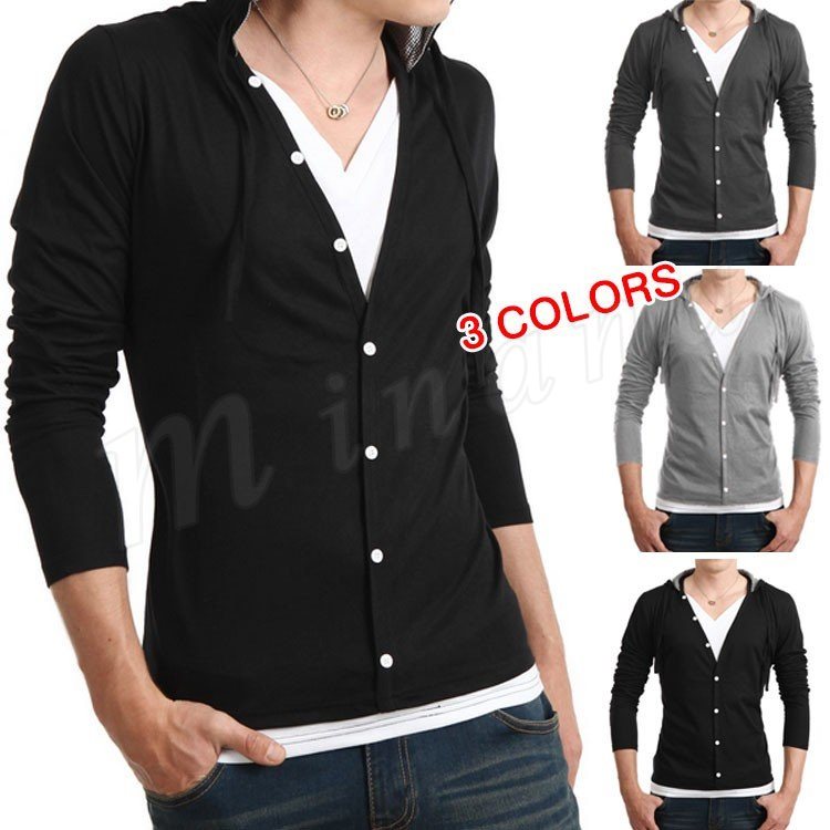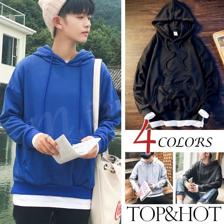 パーカー メンズ 長袖 トップス フェイクレイヤード カジュアル アウター フード スリム