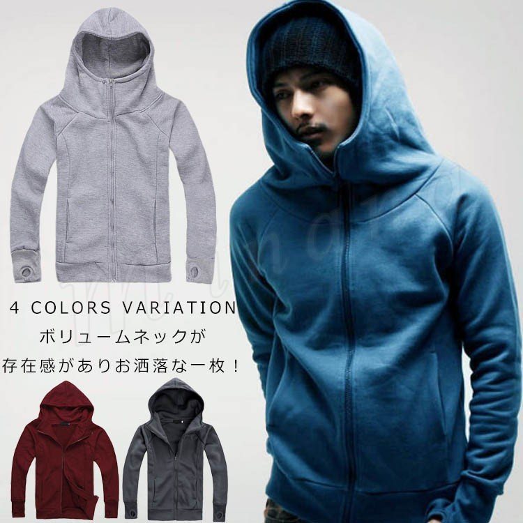 スウェットパーカー メンズ ボリュームネック ジップパーカー 裏ボアパーカー 無地パーカー 大きいフード付きパーカー 春秋パーカー