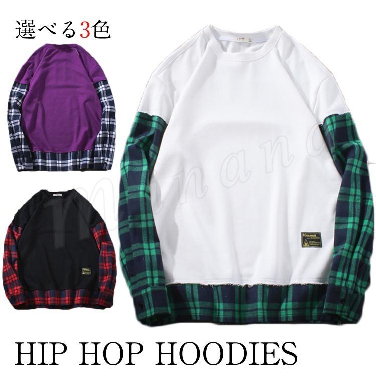 袖二重 レイヤード Tシャツ メンズ 長袖 裾出し 重ね着 クルーネック チェック カジュアル シンプル レイヤード 秋服 カットソー 大きいサイズ
