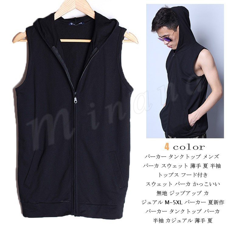 パーカー タンクトップ メンズ パーカ スウェット 薄手 夏 半袖 トップス フード付き かっこいい 無地 ジップアップ カジュアル M-5XL パ
