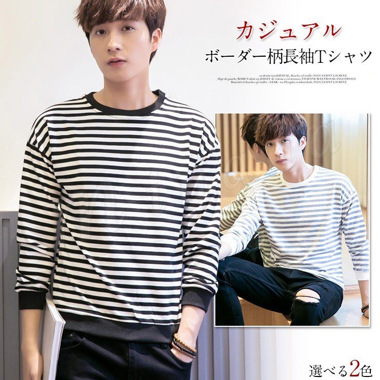 2018春新作 メンズTシャツ ボーダー柄 長袖Tシャツ クルーネック トップス 薄手 シンプル カジュアル 春服 ファッション 春秋 インナー