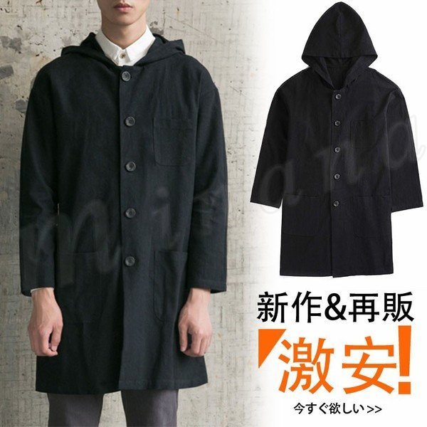 メンズ ロングコート フード付きコート 綿麻素材 スプリングコート パーカコート ロング丈 長袖 秋物コート ゆるコート ベーシック