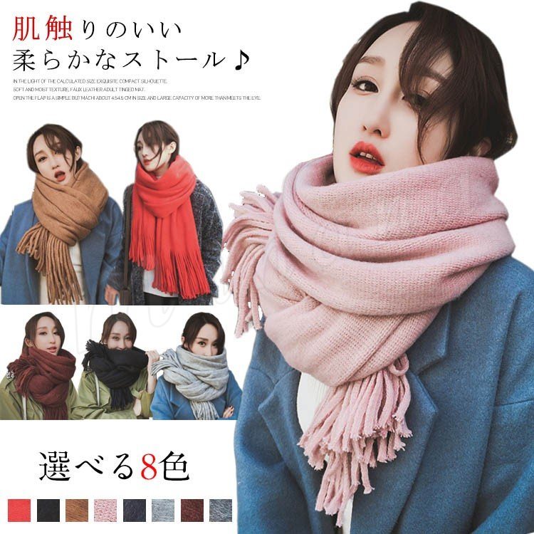 [8色展開]ざっくり編みストール マフラー レディース ストール 大判 無地 柔らかい フリンジ アクリル きれいめ 秋冬 可愛い 女子 フリーサイズ