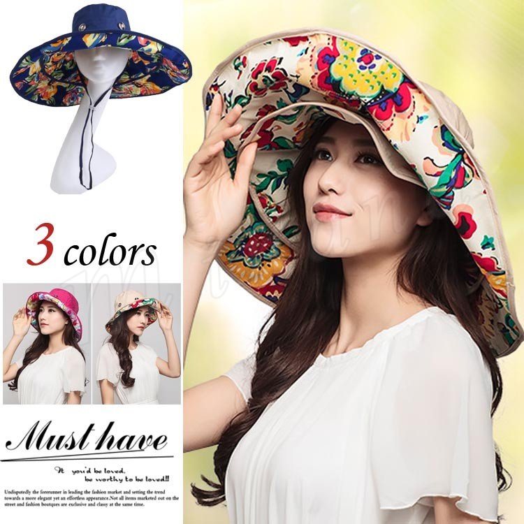 帽子 レディース 大きいサイズ 花柄 折りたため帽子 つば広 ハット 紫外線対策100%カット UVハット 風に飛ばない紐付きHAT 自転車