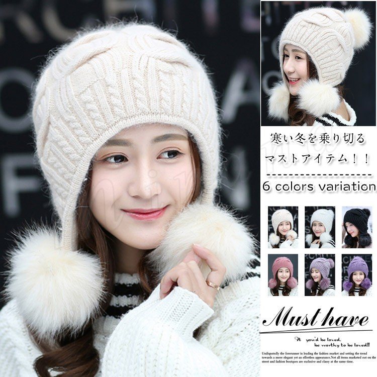 ニット帽子 ボンボン レディース 秋冬 厚手 大きめ 裏起毛 無地 合成繊維 ワンポイント 全6色 黒/白/グレー/ピンク ワンサイズ