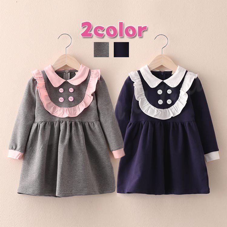キッズ ワンピース 長袖 クルーネック バイカラー Aライン フレア 子供ワンピ 防寒 フリル 女の子 女児 子供ファション