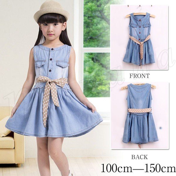 デニムワンピース キッズワンピース ノースリーブ 袖なし 女の子 女児 こども服 子供ワンピース 子供ワンピ 子供ドレス プリーツ 前開き
