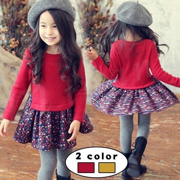 ニットワンピ ワンピース フェイクレイヤード 花柄 長袖ワンピ 女の子 女児 小柄 ニット 切替 ショートワンピ ふんわり シルエット おし