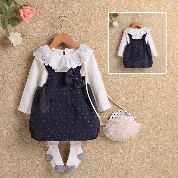 子供服 ブラウス+サロペット2点セット ワンピース ドット柄 人形襟 レースネック 人形ネック 吊りスカート