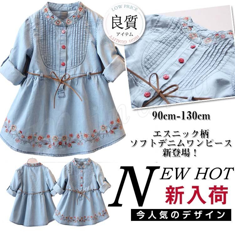刺繍ワンピース 子供ワンピース デニム デニムワンピース エスニック柄 長袖ワンピース 女の子 シャツワンピース 長袖 ワンピース ベルトル