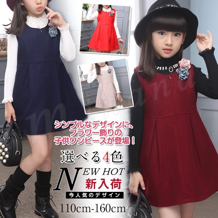 ワンピース 長袖 無地 クルーネック レッドワンピース 子供ワンピ チュニックワンピース ショート丈 キッズ ゆったり 裏起毛 ラシャ
