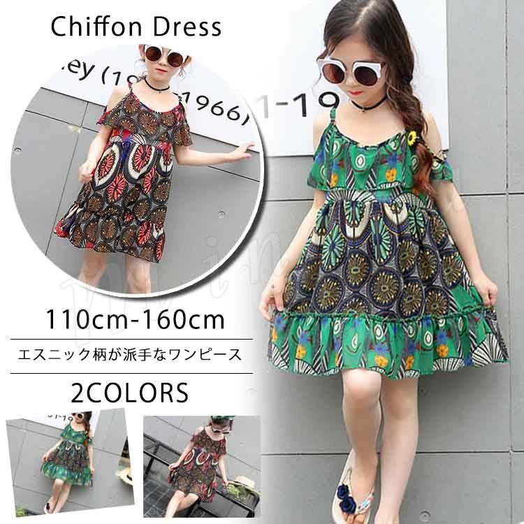 キャミソールワンピース ボヘミア 女の子 キッズ ノースリーブワンピース ワンピース Aライン フレア 肩開き 肩見せ プリント エスニック