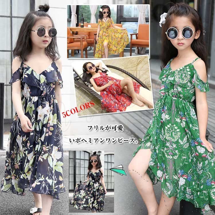 花柄ワンピース アジアン キャミワンピ オフショルダーワンピース フリル ジュニア キッズ フリル 親子ペア イレヘム Vネック 肩出し 肩開