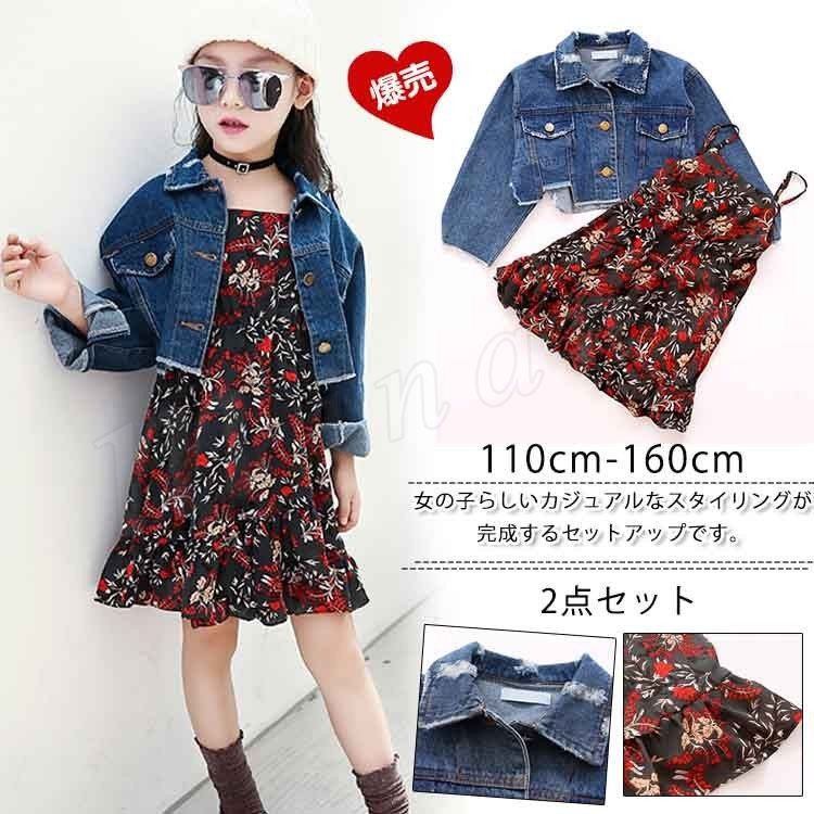 女の子らしいカジュアルなスタイリングが完成するセットアップ 女の子セットアップ デニムジャケット×花柄ワンピース 2点セット 子供服 ダメージ