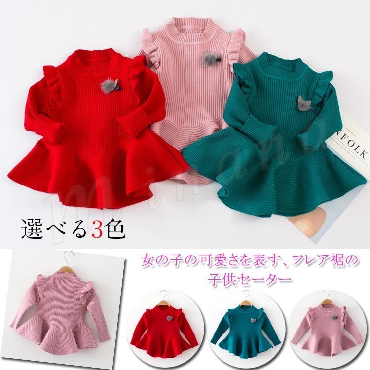 セーター/子供服/女の子/長袖/丸襟/フリル/フレア裾/フェイクファー/純色/無地/伸縮性/厚手/カジュアル/可愛い/スタイリッシュ/お洒落/