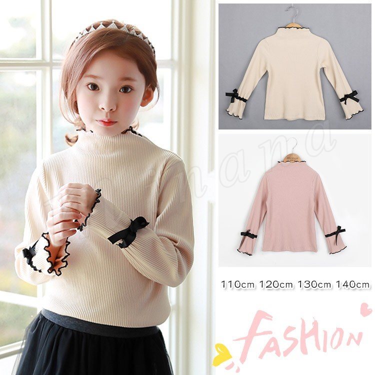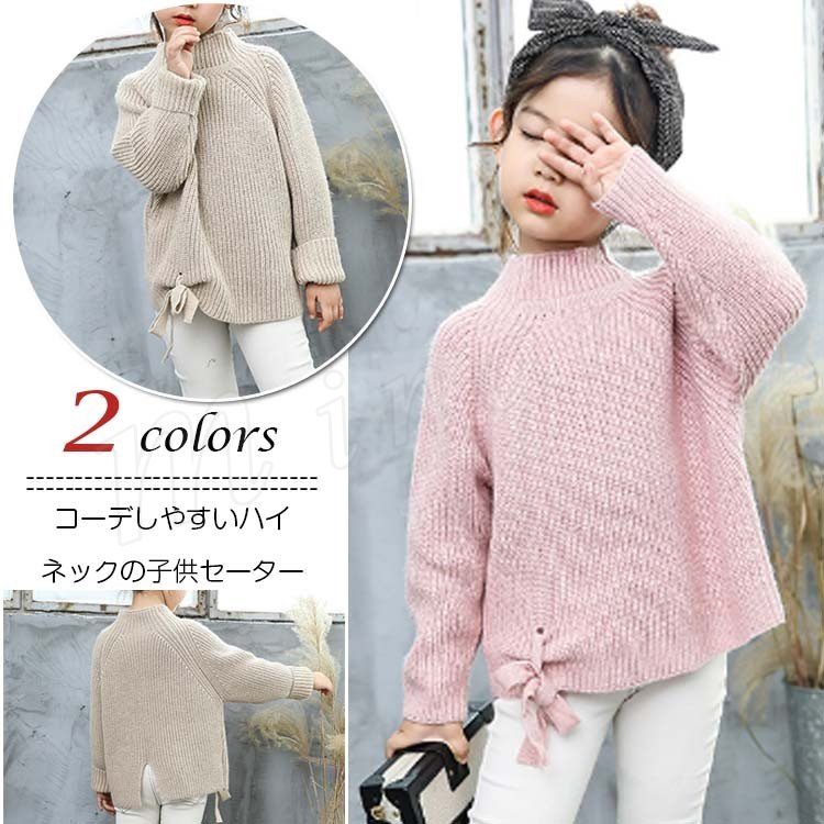 セーター/子供服/女の子/純色/長袖/ドルマンスリーブ/ハイネック/リボン付き/スリット入り/伸縮性/ゆったり/カジュアル/シンプル/可愛い/