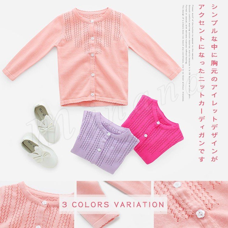 シンプルな中に胸元のアイレットデザインがアクセントになったニットカーディガン 女の子カーディガン 子供服 長袖 スウィート エレガント 可愛い