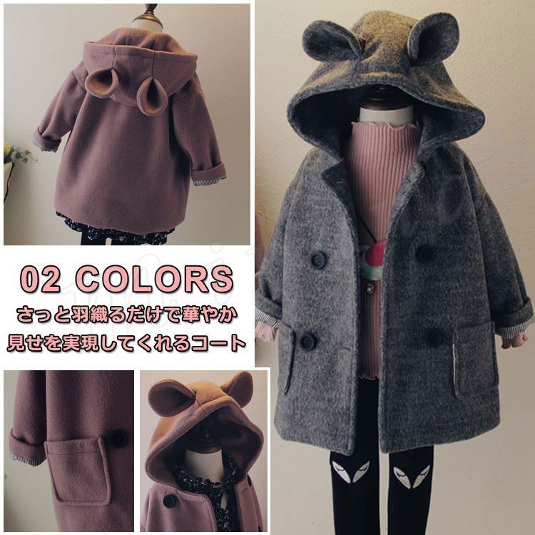 防寒コート/子供/女の子/耳付きコート/コートアウター/ロングコート/カジュアルコート/普段着/子供服/ポケット付き/ダブルボタン付き/厚手/