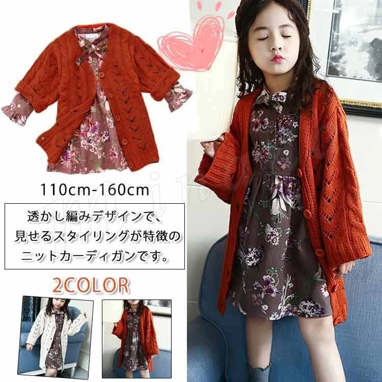 透かし編みデザインで、見せるスタイリングが特徴のニットカーディガン 女の子カーディガン 子供服 ロング丈カーディガン Vネック 可愛い スウィ