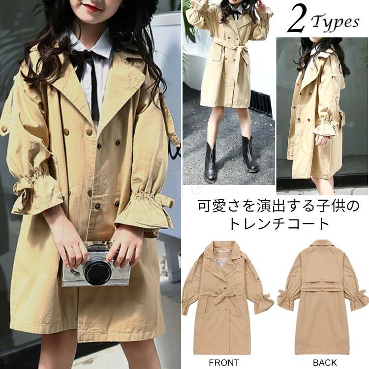 トレンチコート/子供/女の子/コートアウター/ロングコート/カジュアルコート/普段着/キッズコート/子供服/羽織物/ベルト付き/フレアスリーブ