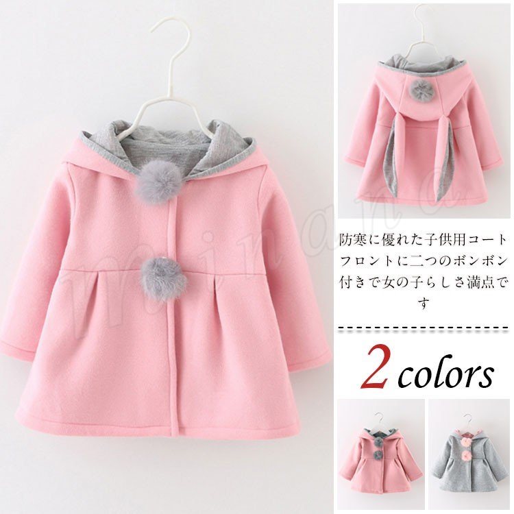 コート/ベビー/キッズ/赤ちゃん/コートアウター/女の子/女児/ショート丈コート/ベビー服/上着/防寒服/うさ耳フード付き/もこもこ/ポンポン