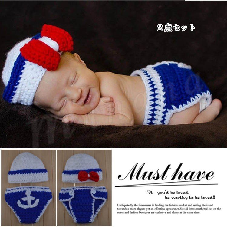 ベビーコスチューム セーラーコスプレ 2点セット 寝相アート ベビー服 記念撮影 毛糸 ハンドメイド コスチューム 写真撮影用 誕生記念 赤ち