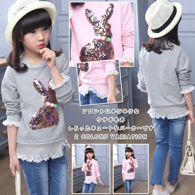 フロントにキラキラなウサギをあしらったキュートなパーカー 女の子パーカー キッズトレーナー 子供服 長袖 クルーネック レース スウィート 上