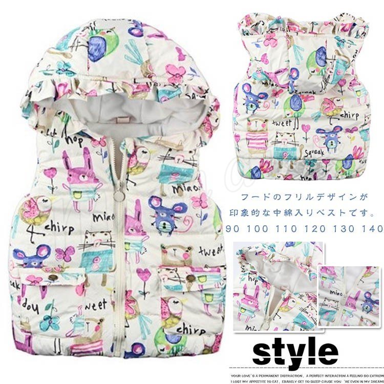 フードのフリルデザインが印象的な中綿入りベスト 女の子ベスト 子供服 アウター アニマル フードつきベスト スマート 可愛い キュート カジュ