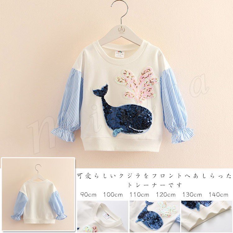 可愛らしいクジラをフロントへあしらったパーカー 女の子パーカー キッズトップス プルオーバー クールネック 長袖 袖切替 フレア ストライプ柄