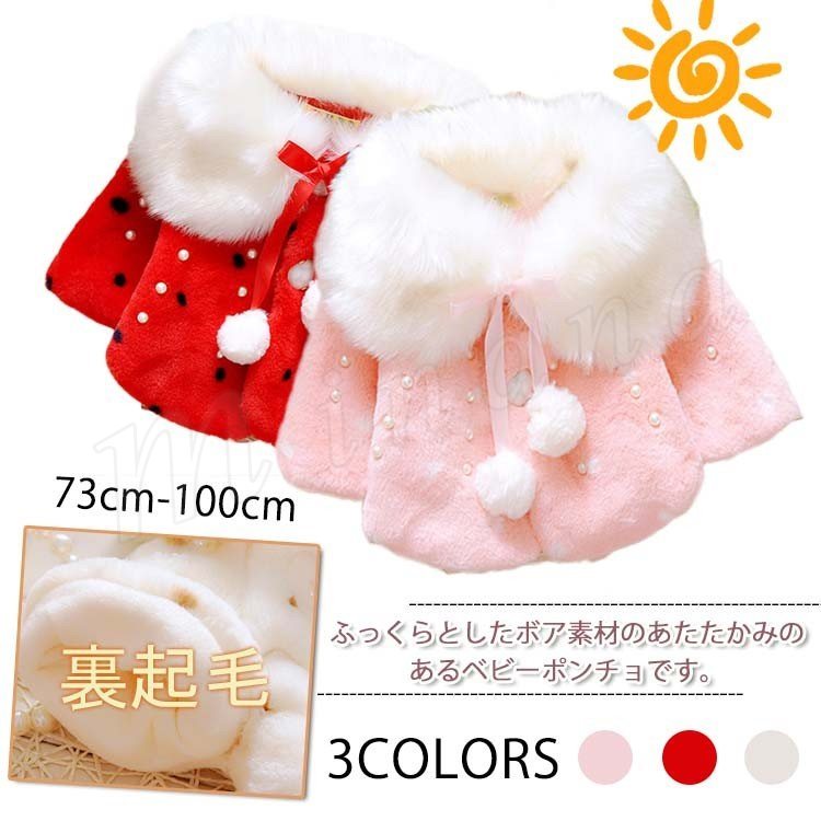 ふっくらとしたボア素材のあたたかみのあるベビーポンチョ 女の子 ケープ マント ベビーアウター フェイクファー トッド柄 パール付き Aライン