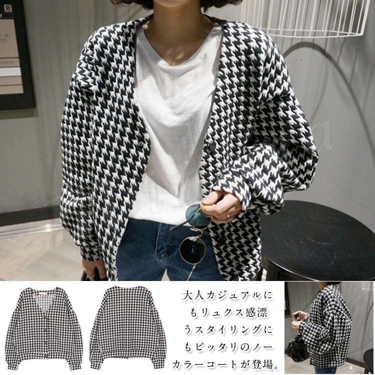 レディース レトロ調 コート アウター ジャケット ジャンパー ブルゾン バルーンスリーブ 長袖 千鳥格子 ノーカラー Vネック無地 フリーサイズ