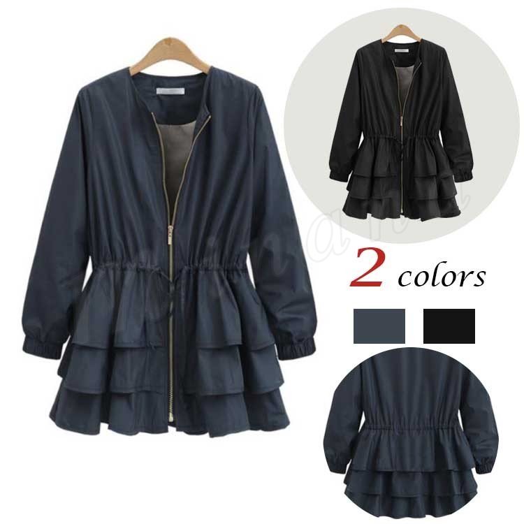 ブルゾン レディース ブルゾンジャケット ジャケット アウター フリル ノーカラー おしゃれ ブラック 秋冬新作 M/L/XL/2XL/3XL