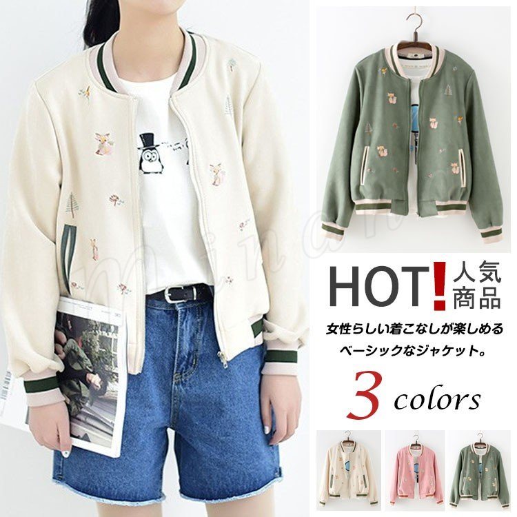 ジャンバーウェアレディースブルゾンジャケットノーカラージャンバーブルゾン刺繍柄カジュアルかわいいブルゾン羽織春ジャンバー
