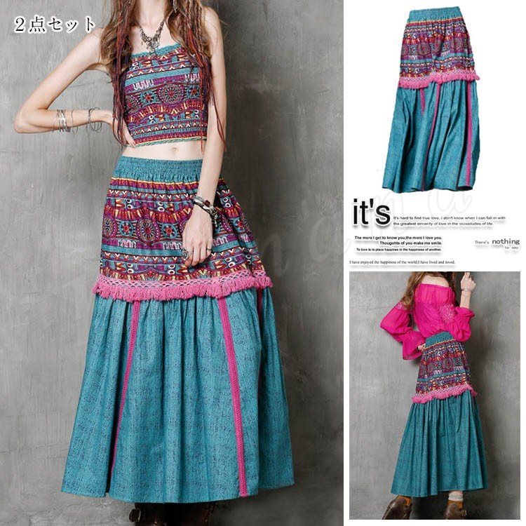 レディース オリジナルデザイン エスニック系 ベアトップ オフショルダー フェミニン 肩見せ プリント 柄物 肩出し 綿麻素材