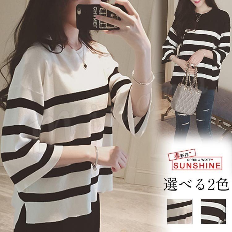 セーター ゆったり プルオーバー ニットトップス ボーダー柄 大きいサイズ レディース スリット入り 半袖 5分袖 ボーダー ニット